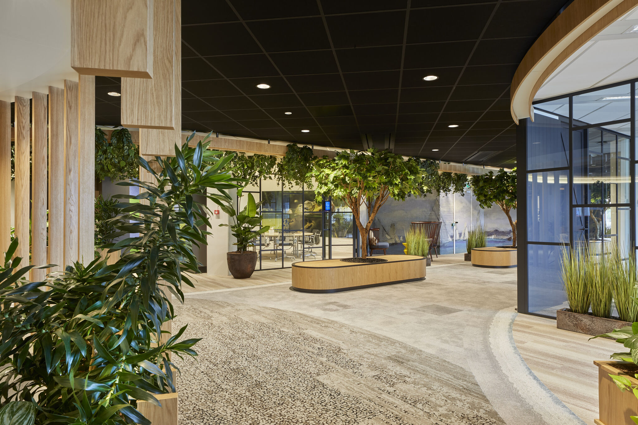 Op de eerste verdieping bevindt zich het zogeheten kantoorpark: een groene, open werkomgeving van 1700 m² met volop daglicht, natuurlijke materialen, planten en themaruimtes zoals een Japans theehuis en een bibliotheek. Zelfs de geur is ontworpen om een ‘buiten-gevoel’ op te roepen. Deze thematische werkomgeving, ontworpen en ingericht door PD Group, vormt het hart van het vernieuwde Raadhuis – een plek voor hybride werken, ontmoeten en vergaderen. Een tastbaar voorbeeld van de visie die Scherder eerder die middag onderbouwde: als de omgeving klopt, floreert de mens.