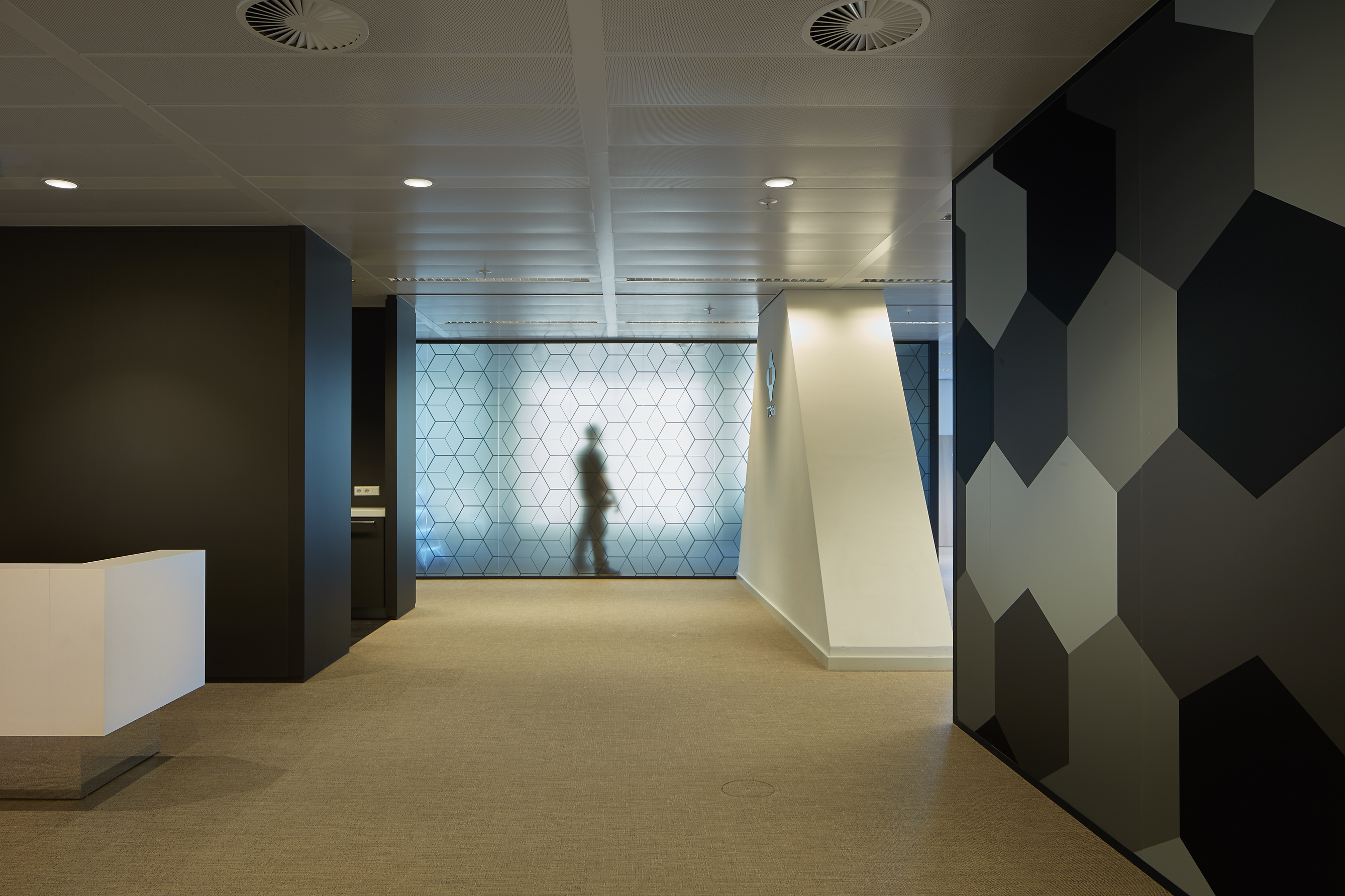 “In het ontwerp hebben we rekening gehouden met de identiteit van Tosoh en de functionaliteit van de diverse ruimtes. We hebben vooral rust willen creëren op deze verdieping, waarbij alle functies tot zijn recht komen. Zo zijn er open space werkplekken gerealiseerd, vergaderruimtes, een mooie entree met receptie en ontvangstruimte en een sfeervolle keuken met lunchruimte. We hebben de scheidingswanden voorzien van een uniek design. Opvallende visuals op de wanden versterken het imago van Tosoh”, zegt Orlando Tjin Asjoe.