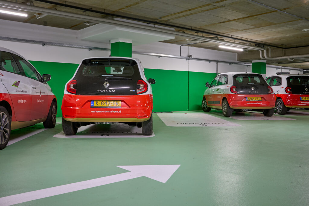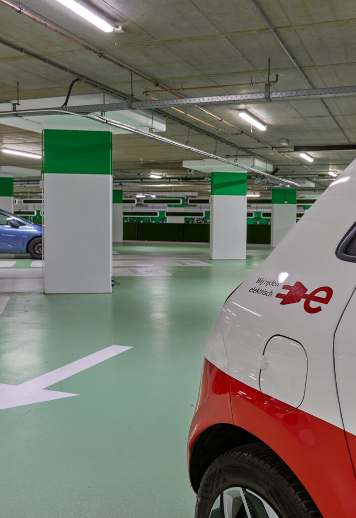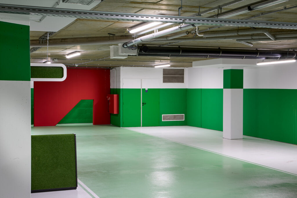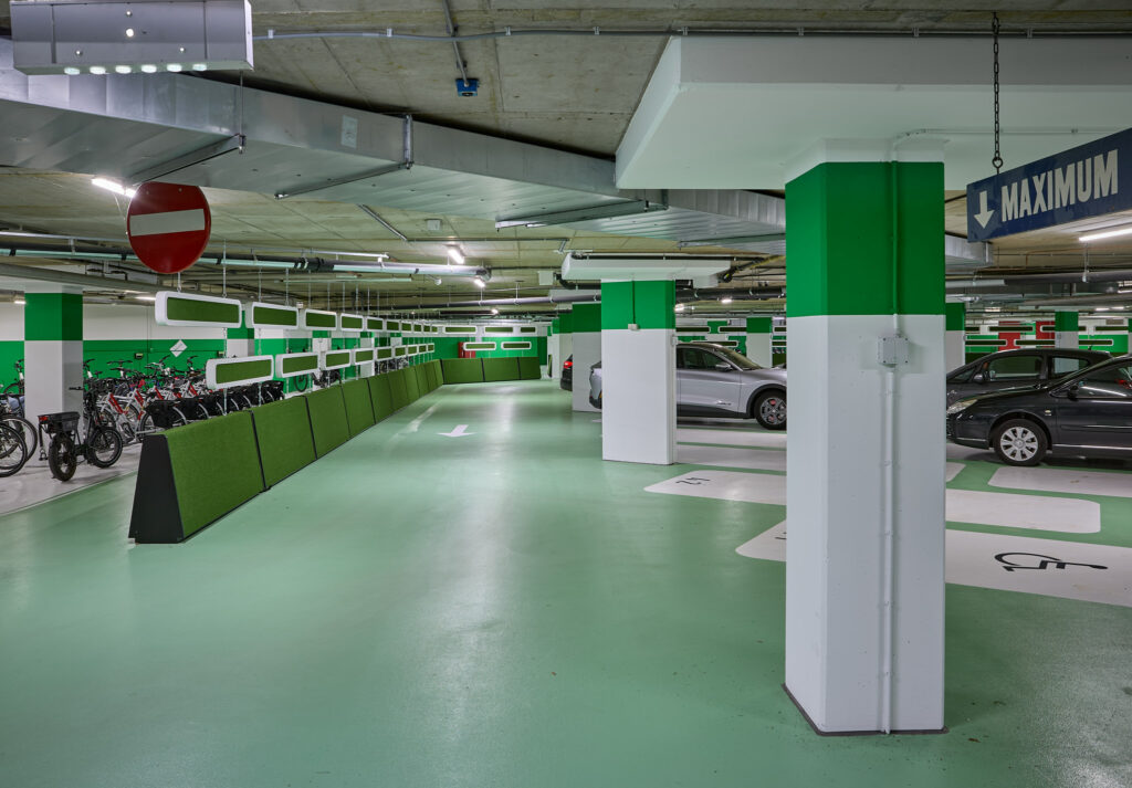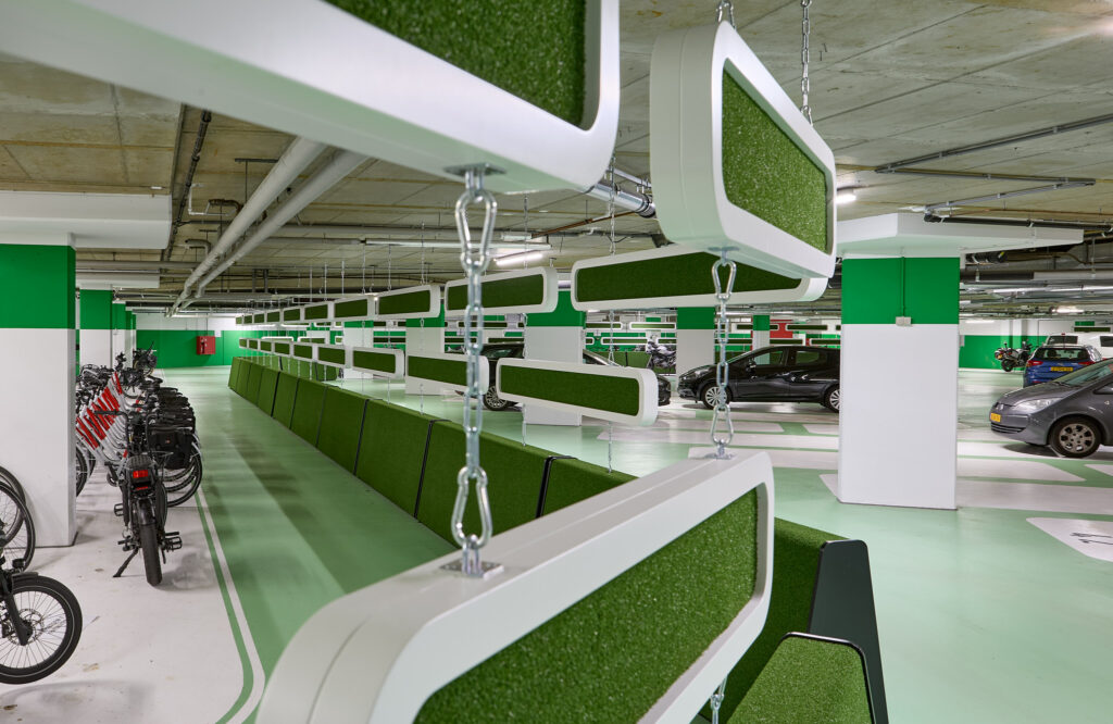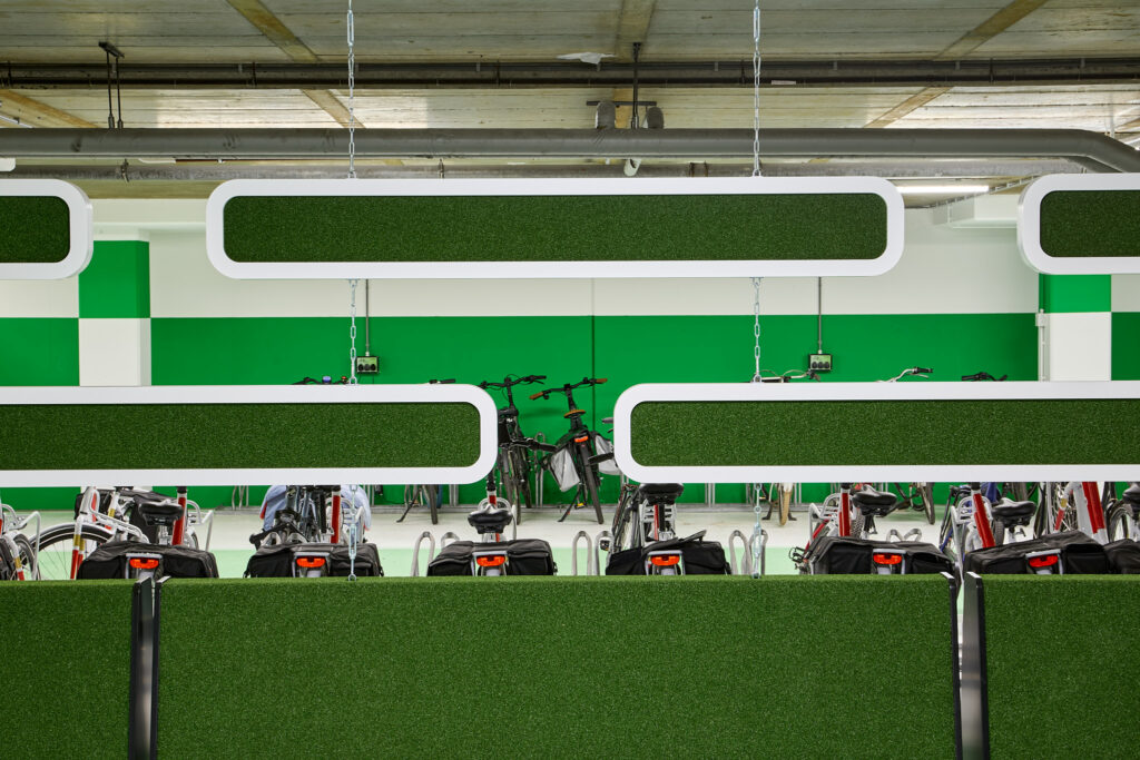 Het doel was om een overzichtelijke omgeving te realiseren met een duidelijke routing. Er is gekozen voor kort kunstgras om een grens te vormen tussen de parkeerplekken voor auto’s en de ruimte voor fietsen. Deze groene elementen dienen niet alleen als visuele scheiding, maar behouden ook de ruimtelijkheid van de parkeergarage. Het groen is doorgetrokken naar de vloer, met parkeervakken die afwijken in kleur om verschillende zones aan te geven. Ook zijn er duidelijk, gemarkeerde plekken voor allerlei verschillende soorten fietsen.