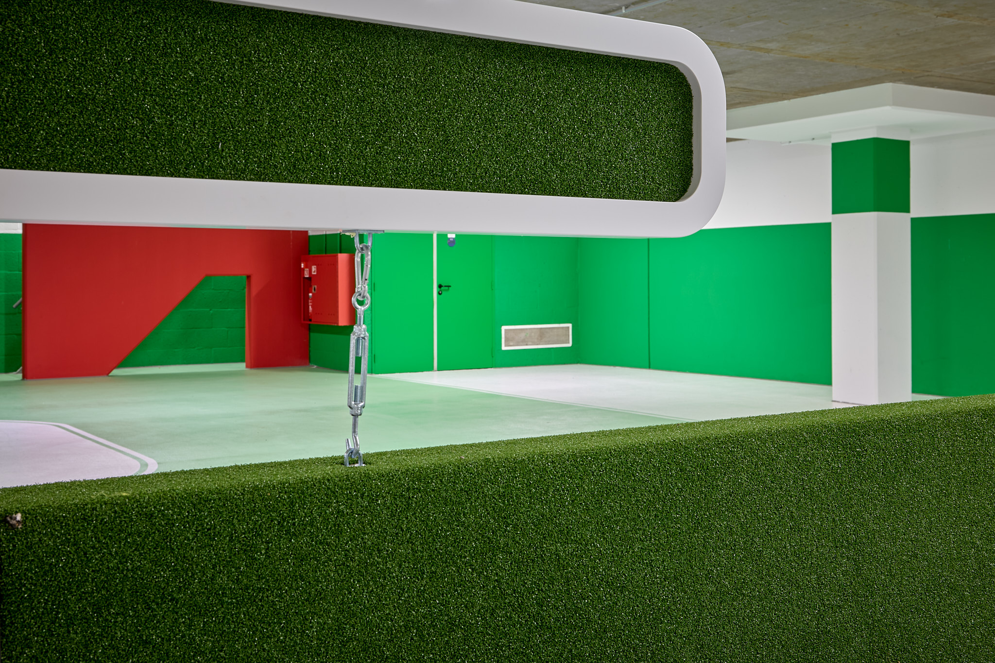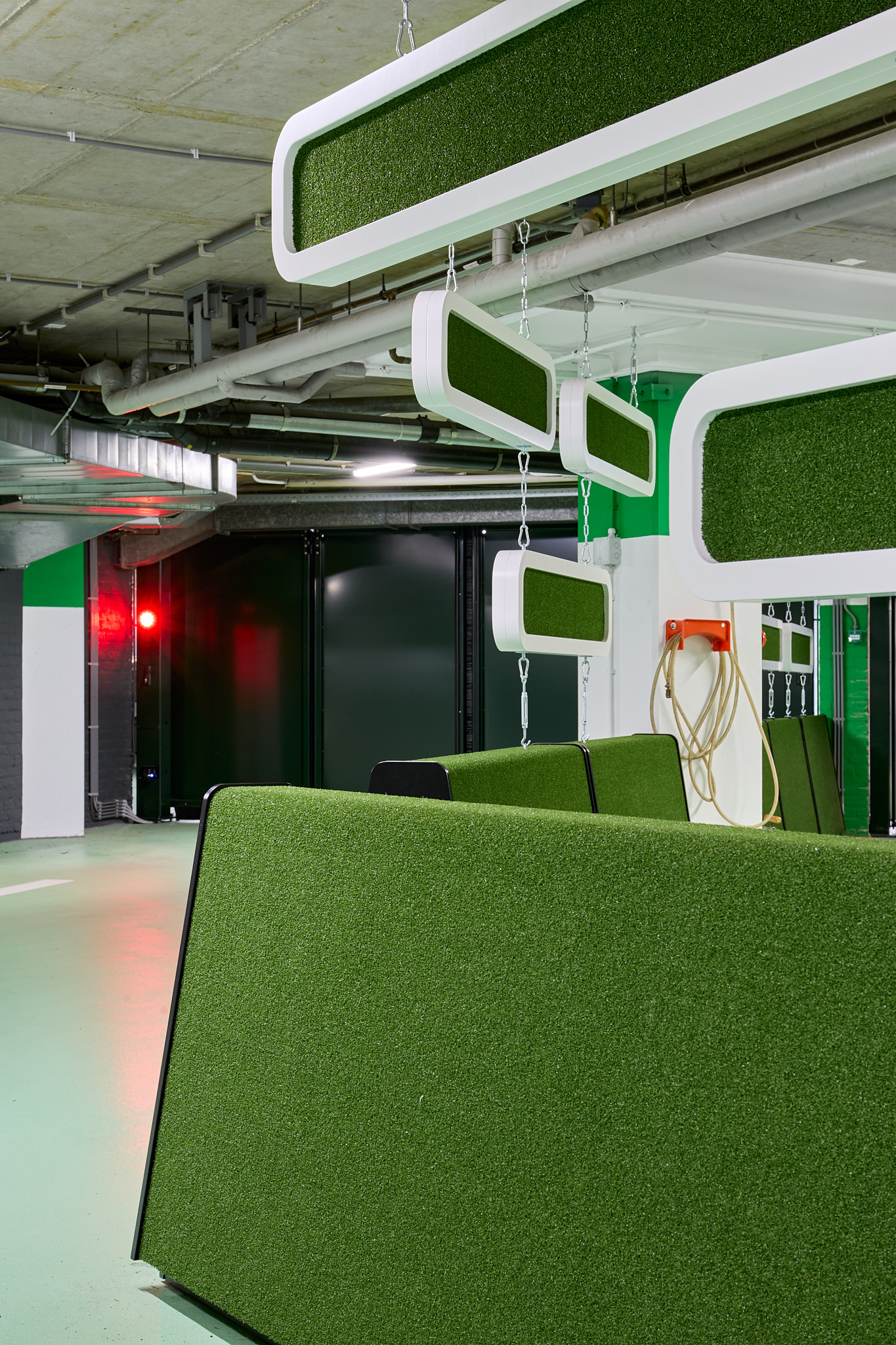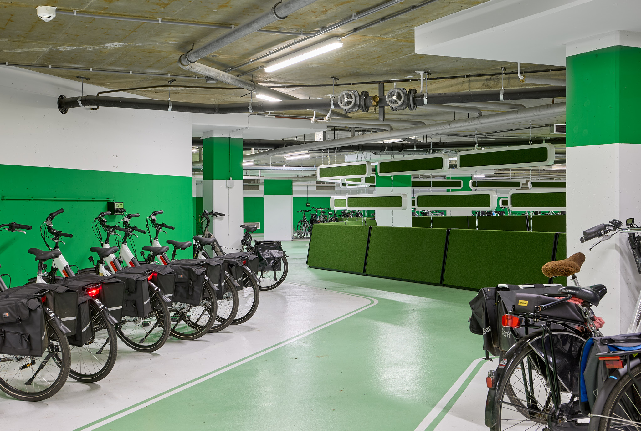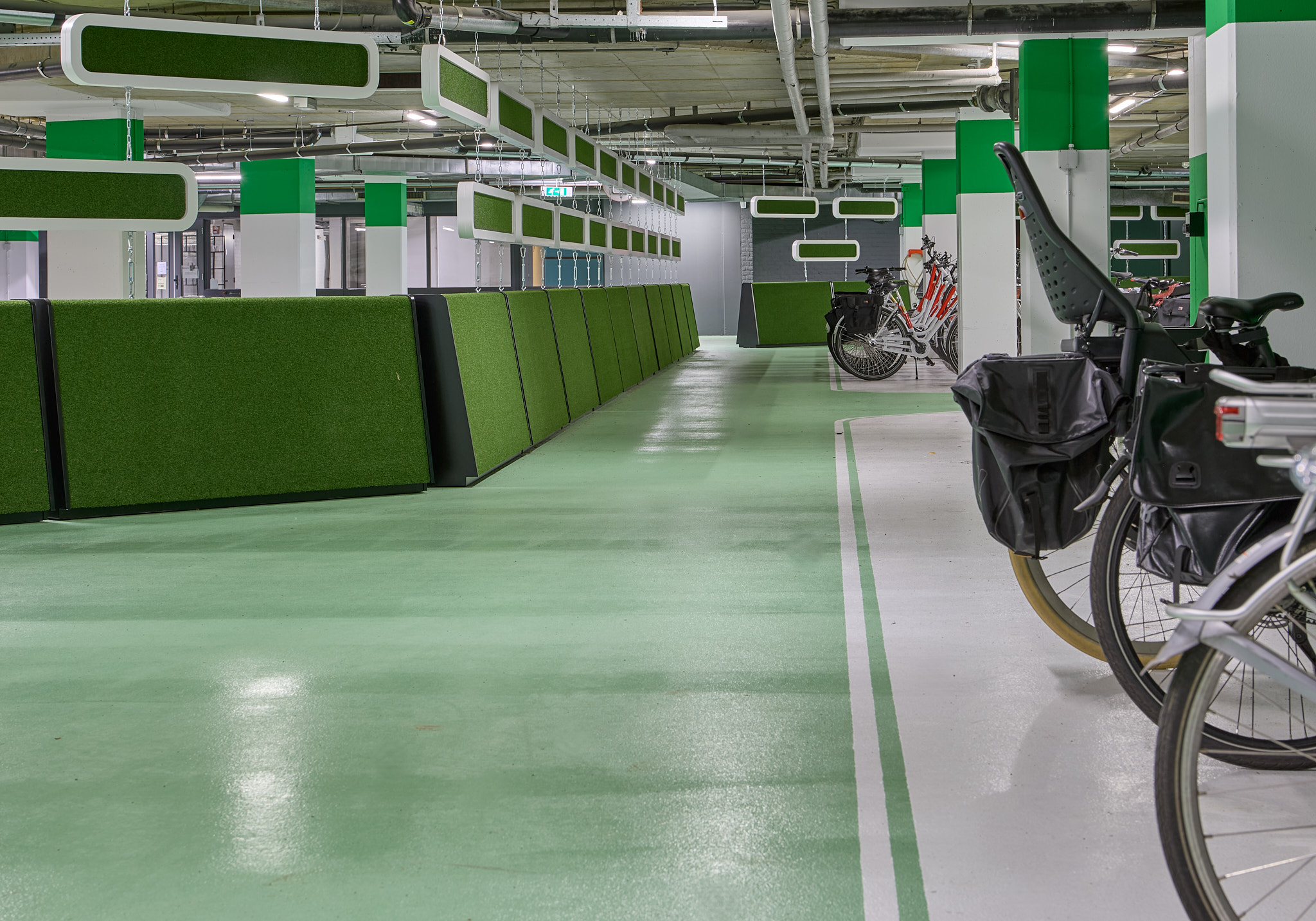 Het doel was om een overzichtelijke omgeving te realiseren met een duidelijke routing. Er is gekozen voor kort kunstgras om een grens te vormen tussen de parkeerplekken voor auto’s en de ruimte voor fietsen. Deze groene elementen dienen niet alleen als visuele scheiding, maar behouden ook de ruimtelijkheid van de parkeergarage. Het groen is doorgetrokken naar de vloer, met parkeervakken die afwijken in kleur om verschillende zones aan te geven. Ook zijn er duidelijk, gemarkeerde plekken voor allerlei verschillende soorten fietsen.