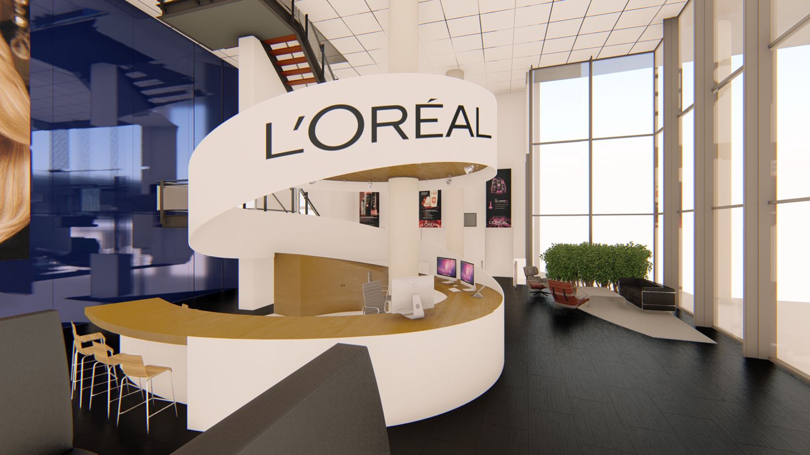 Het design van de nieuwe balie is geïnspireerd door een gekrulde haarlok, geheel passend bij het beautymerk. Vanachter de balie is er zicht op alle kanten van de ruimte. Tevens is er voldoende ruimte om te werken en om spullen op te bergen.