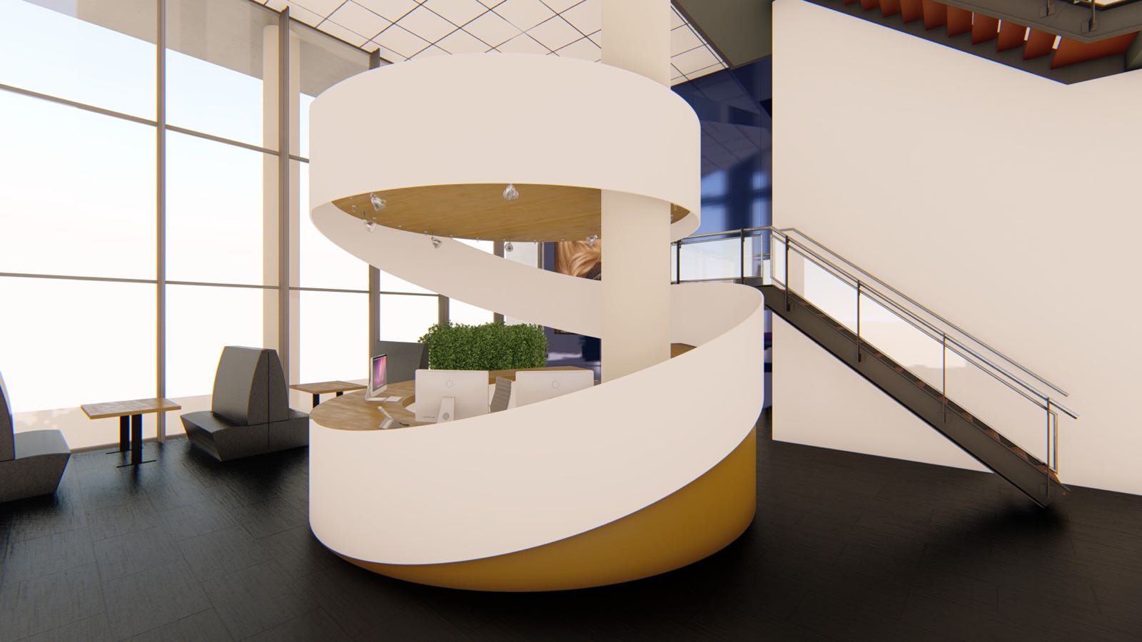Het originele ontwerp van de balie was nog veel meer een ‘krul’. Maar om technische redenen is het ontwerp helaas iets aangepast. (De afbeeldingen van het oorspronkelijke ontwerp van de balie hebben we toegevoegd bij de afbeeldingen.)