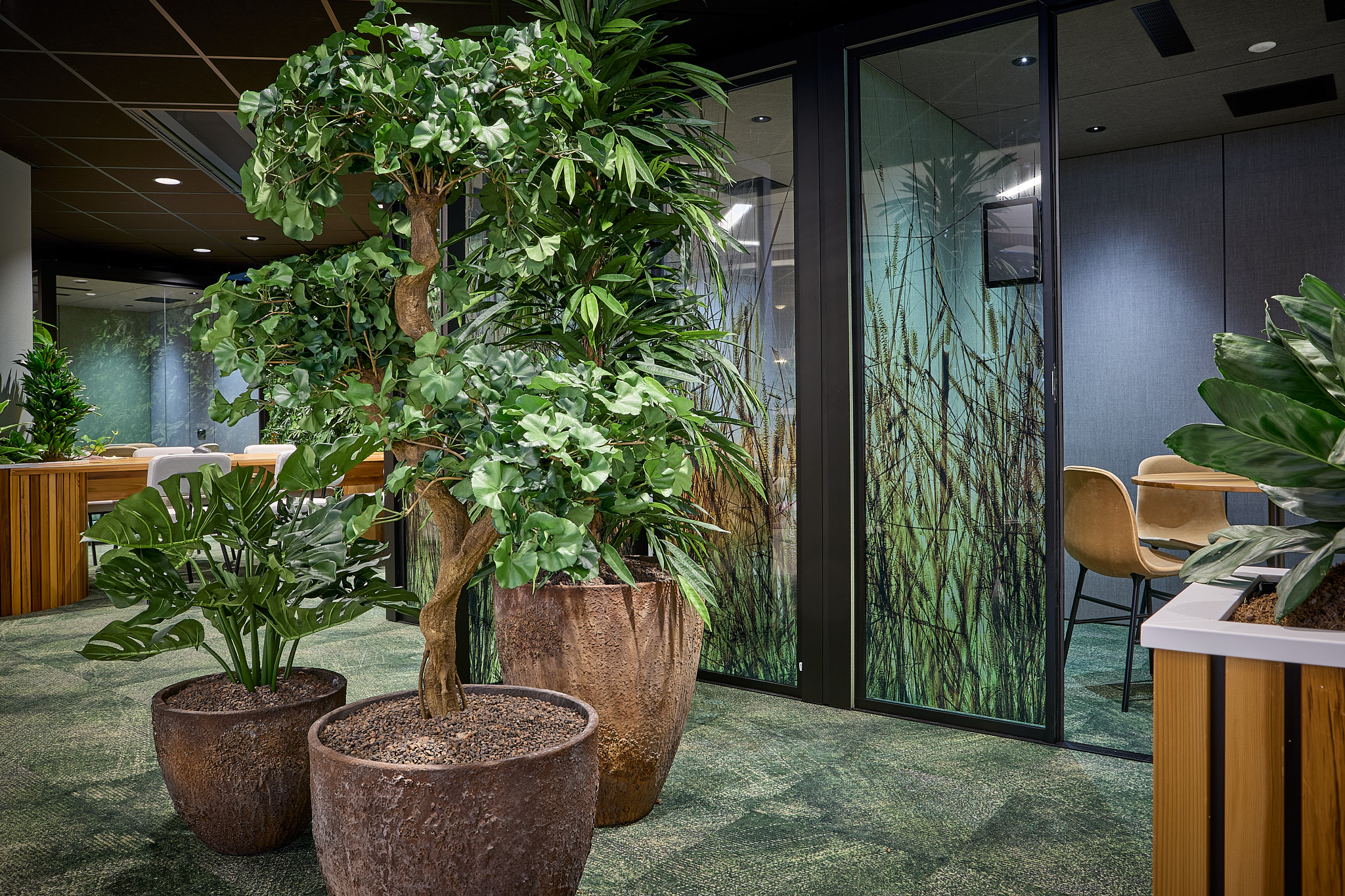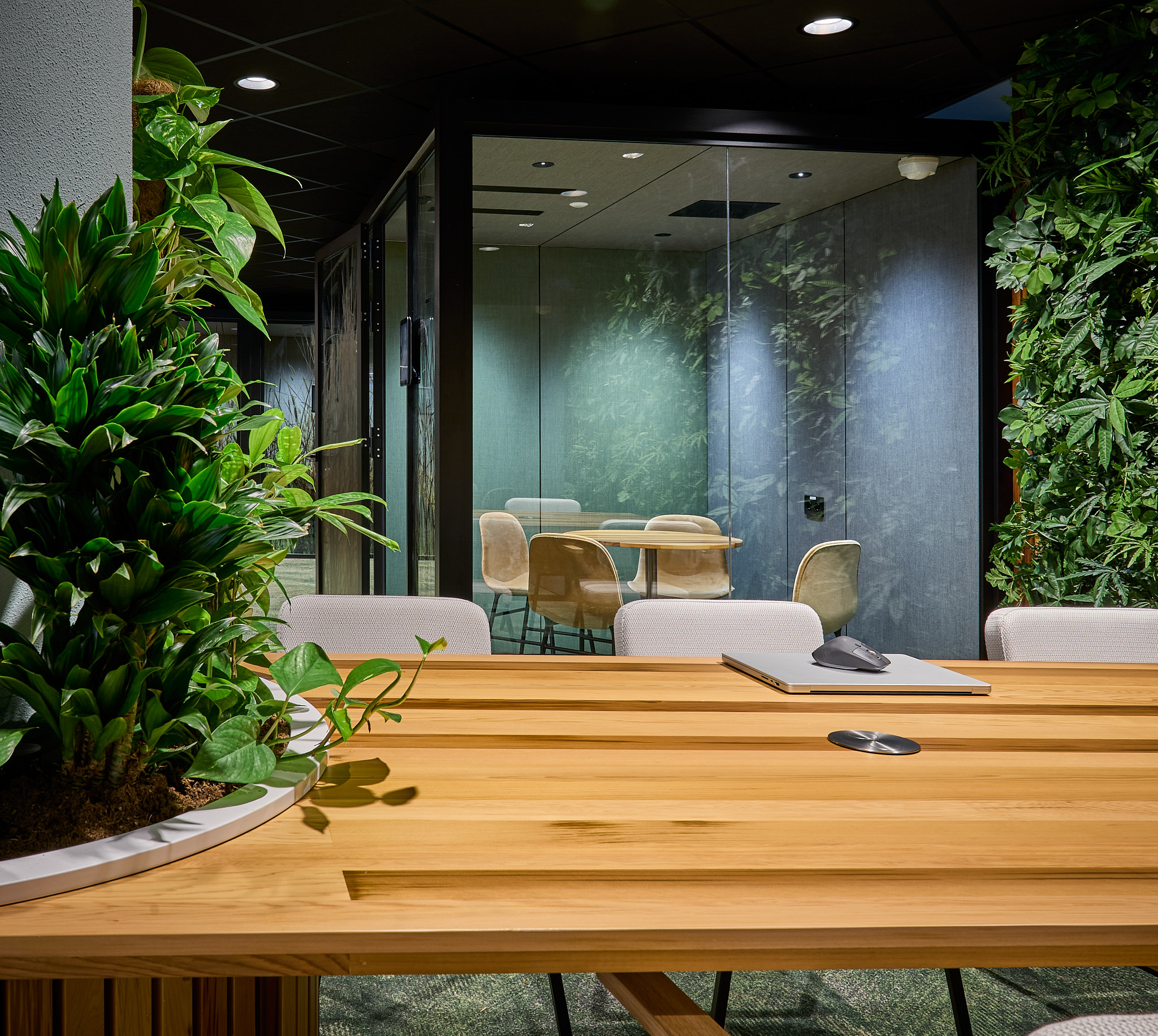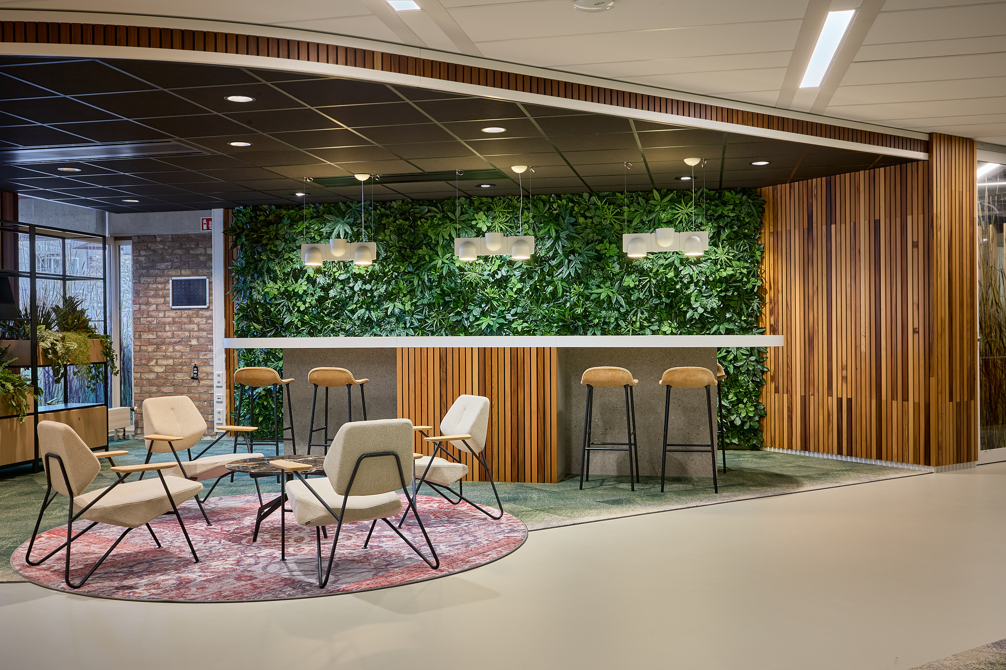 Een bijzonder aspect van het interieurontwerp is het gebruik van warme houten wandafwerking, afkomstig van de buitengevel van het Raadhuis zelf. Tijdens de renovatie is deze houten bekleding apart gehouden en opnieuw gebruikt in verschillende interieurelementen van de grote verbouwing. Nu dus ook in het werkplein. Dit is niet alleen gedaan vanuit een duurzaamheidsoogpunt, maar ook om verbinding te houden tussen het historische karakter van het Raadhuis en de moderne renovatie.
