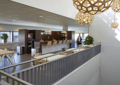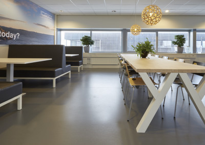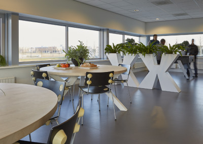 Door het bar element centraal in de ruimte te plaatsen wordt de ruimte op een natuurlijke manier in verschillende zones verdeeld. Een zone waar ronde tafels staan en die door groepen kunnen worden gebruikt. Een zone waar tafelvoetbal gespeeld kan worden en waar de vending machines geplaatst zijn. Een zone met insteekbankjes, zowel voor de lunch als intern overleg, en een stamtafel/bar waarin alle faciliteiten zijn ondergebracht. Achter de bar is nog een rustige plek waar werknemers van logistiek in de pauze gebruik kunnen maken van twee computers. Er moesten keuzemogelijkheden binnen de ruimte ontstaan. Hierdoor wordt de ruimte door meer medewerkers gebruikt voor verschillende doeleinden gedurende de hele dag.