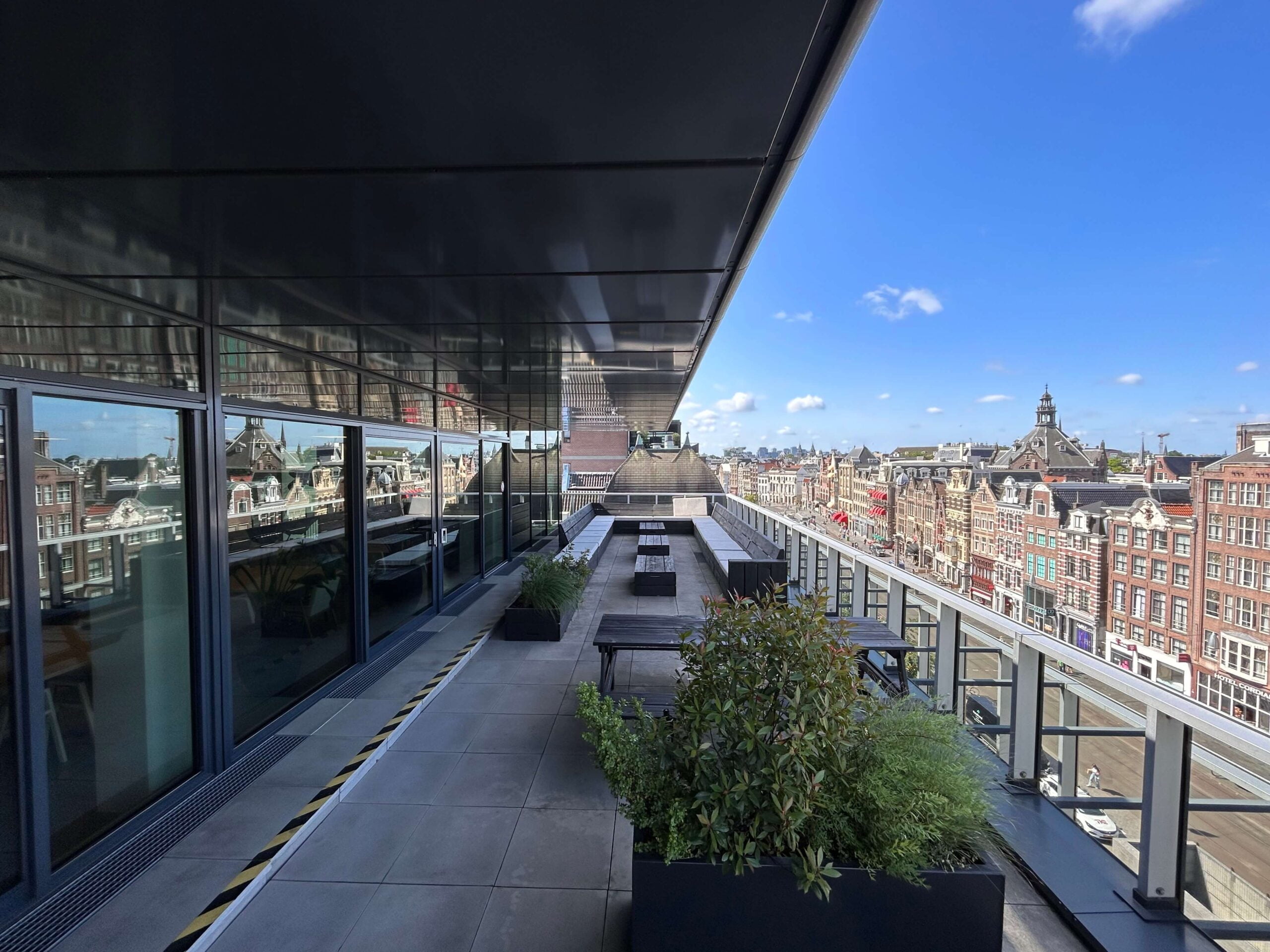 Een extra troef van de vernieuwde zesde verdieping is het aangrenzende dakterras. Dit biedt medewerkers de mogelijkheid om in de zomermaanden buiten te werken of te ontspannen, wat de onderlinge samenwerking en teamdynamiek versterkt. Het terras fungeert als een verlengstuk van de ontmoetingsruimtes binnen, waarbij het uitzicht over Amsterdam zorgt voor een inspirerende setting en een connectie met de stad.