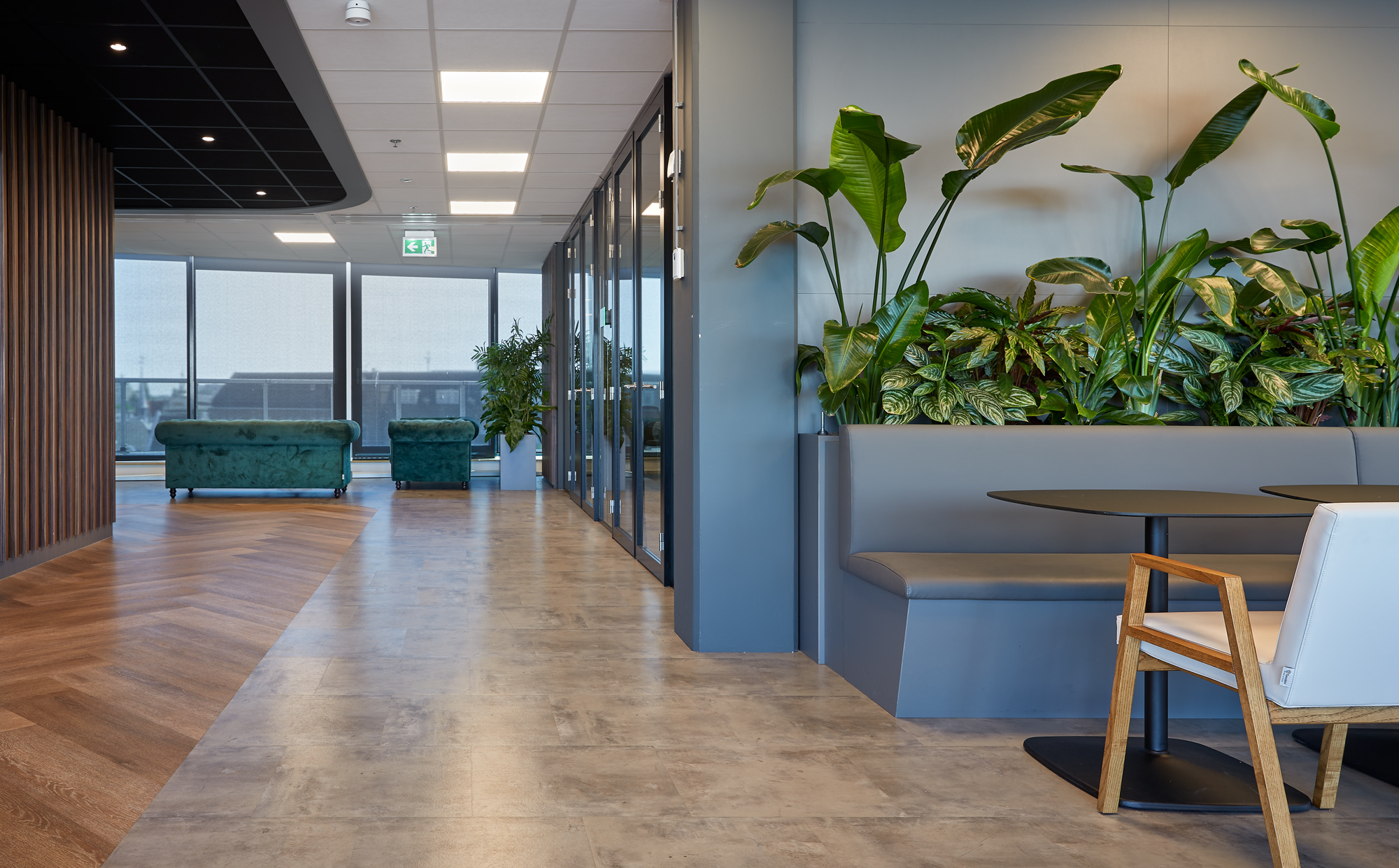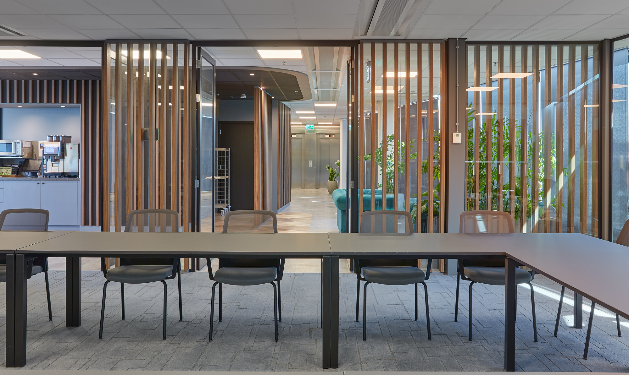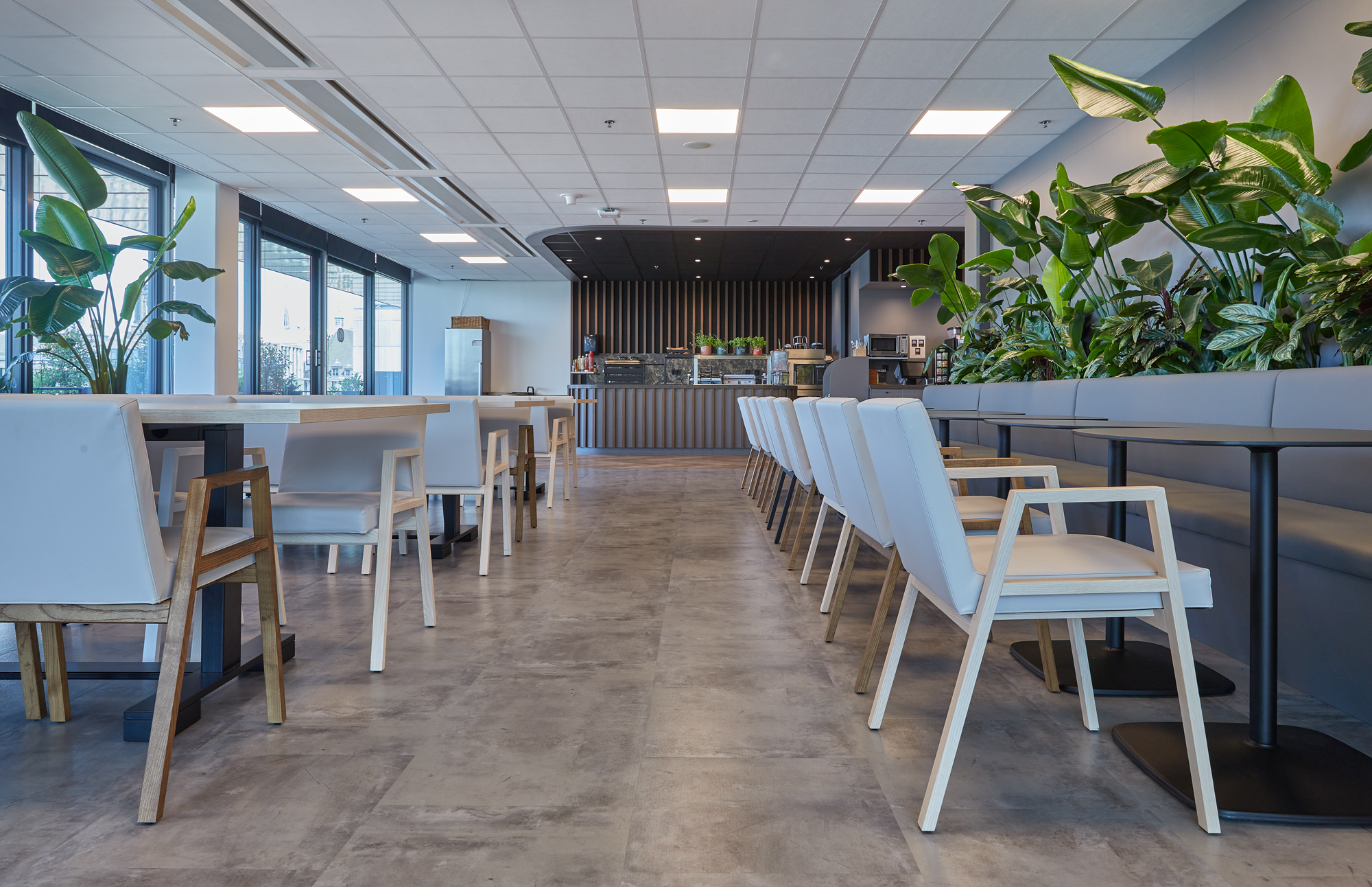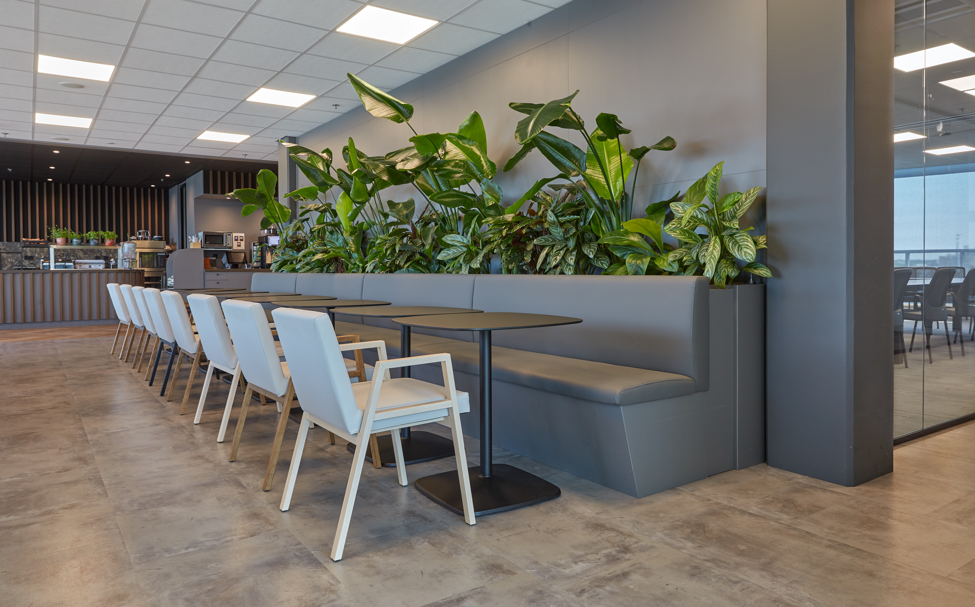 Om een prettige werkervaring te creëren, zijn rond het atrium op verschillende verdiepingen coffeecorners, zitjes en belcellen geplaatst. Deze strategische indeling zorgt ervoor dat medewerkers zich kunnen terugtrekken in een rustige werkomgeving, terwijl informele ontmoetingen en overlegmomenten op natuurlijke wijze plaatsvinden zonder de concentratie van anderen te verstoren.