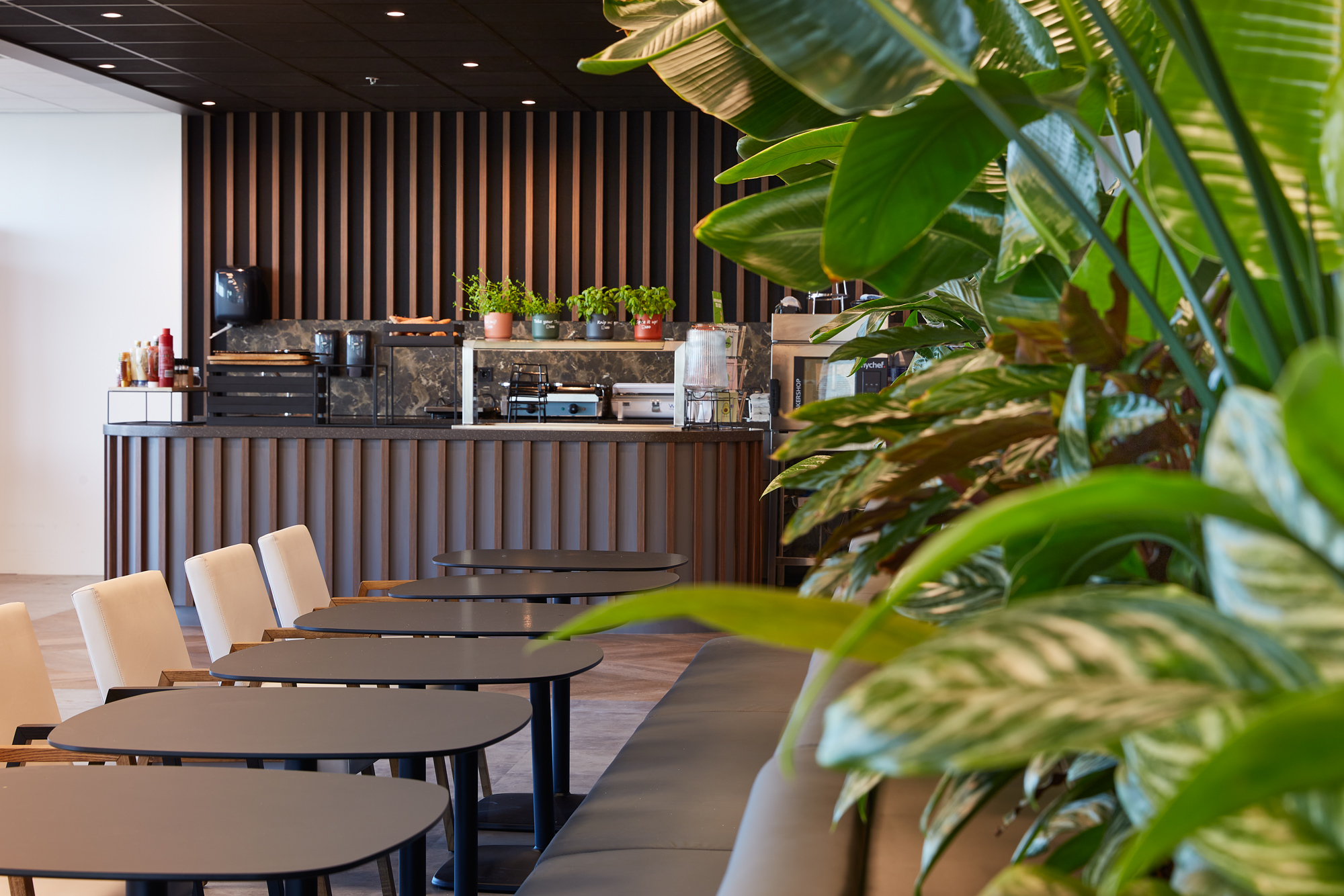 Een van de belangrijkste toevoegingen is een ruime vergaderzaal, waar onder andere de wekelijkse redactievergaderingen op maandagochtend plaatsvinden. Daarnaast zijn er diverse vergaderruimtes van verschillende formaten gecreëerd, zodat teams flexibel kunnen overleggen in een inspirerende omgeving. Het grootste deel van de zesde verdieping is ingericht als bedrijfsrestaurant, een plek waar medewerkers niet alleen samenkomen voor ontbijt, lunch en diner, maar ook informeel kunnen overleggen of even aan de keukentafel kunnen werken. De open keuken draagt bij aan de huiselijke sfeer.