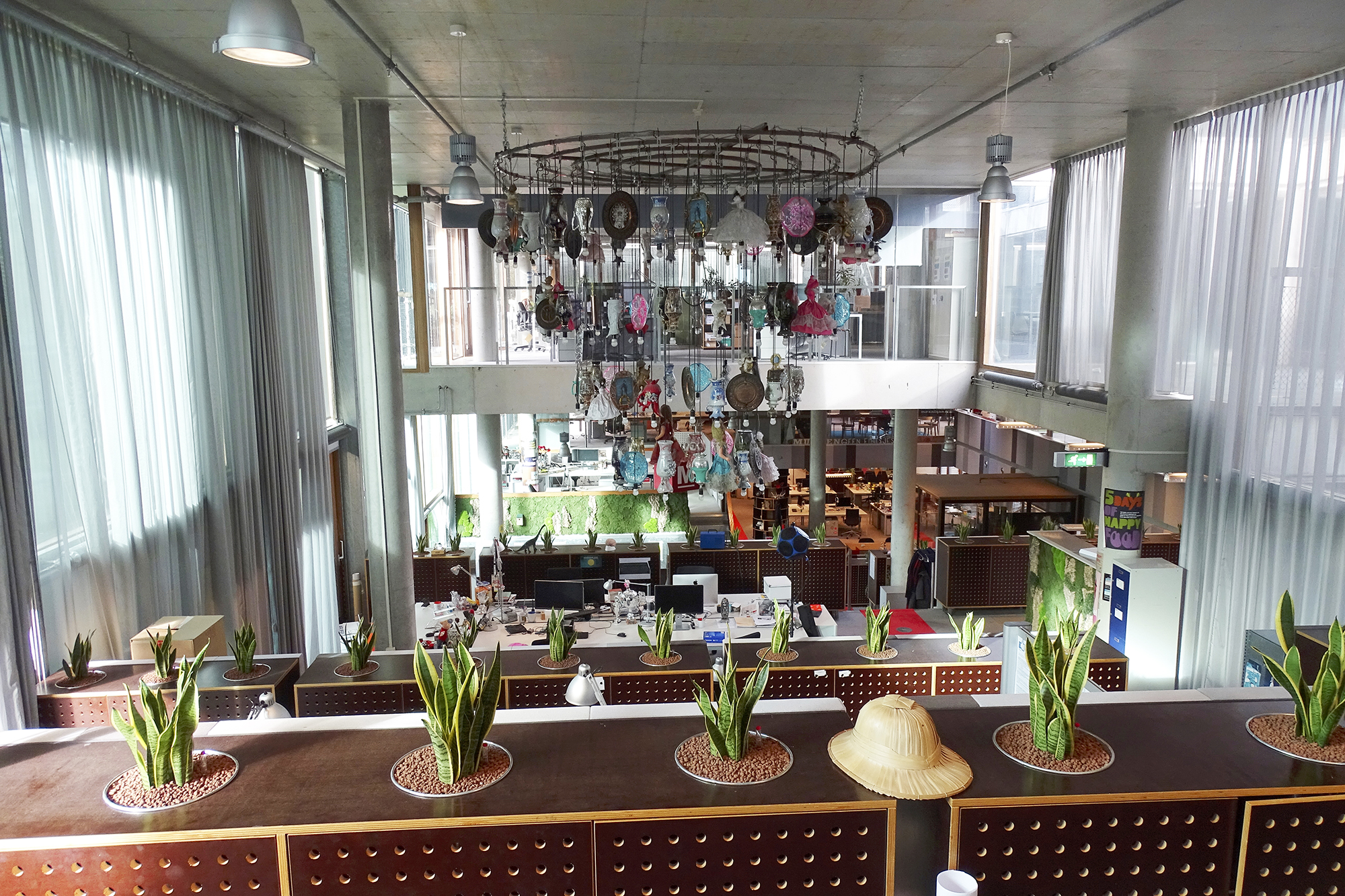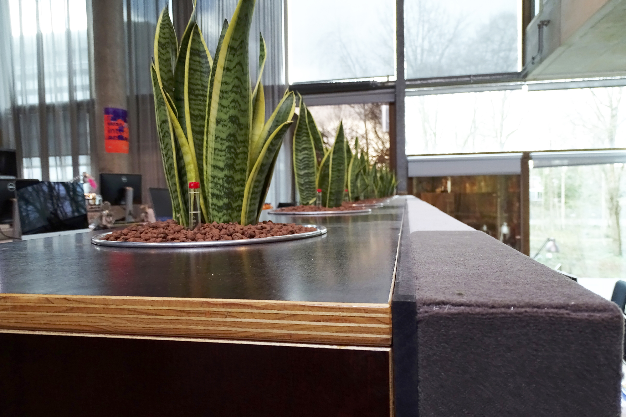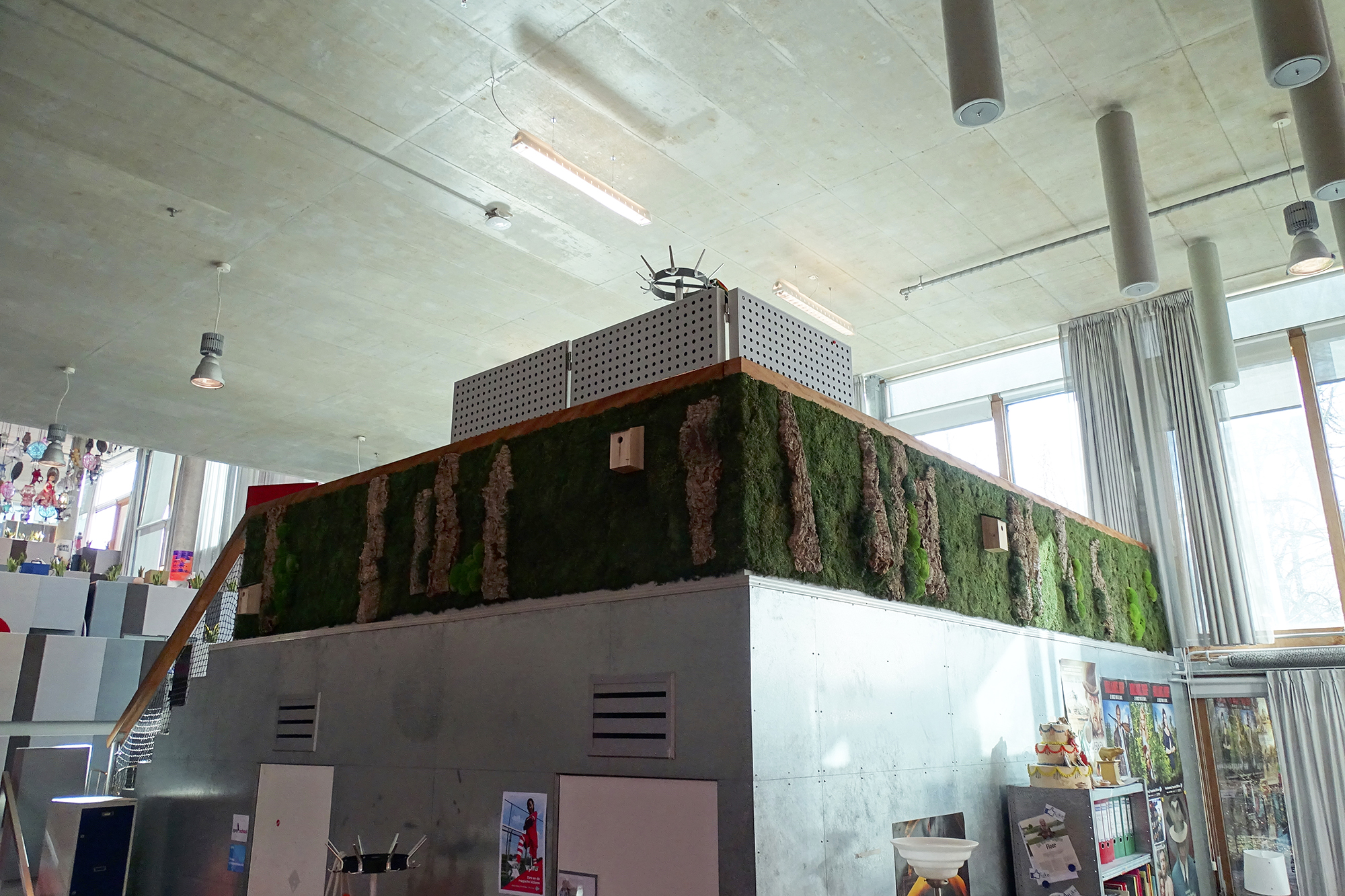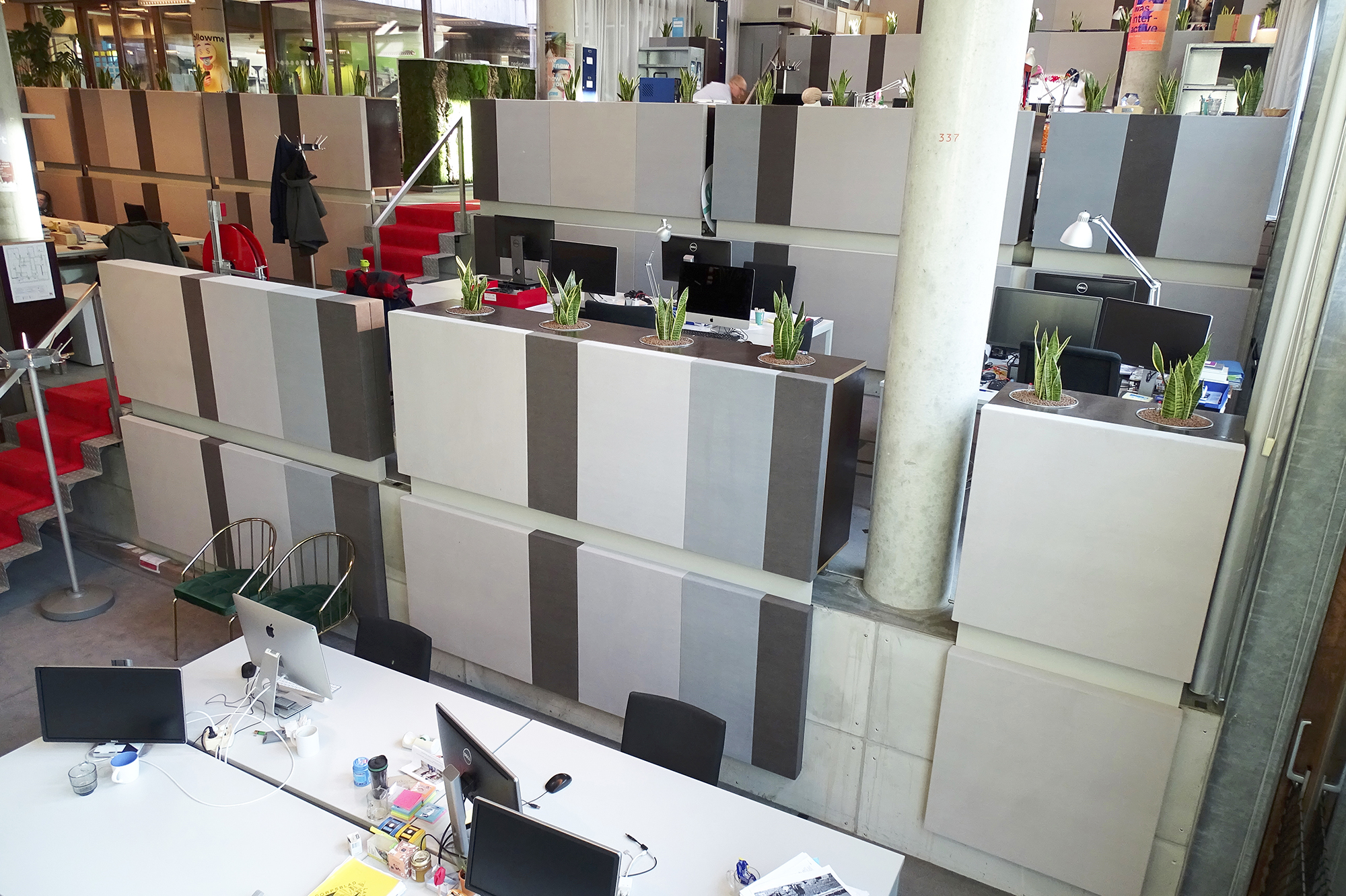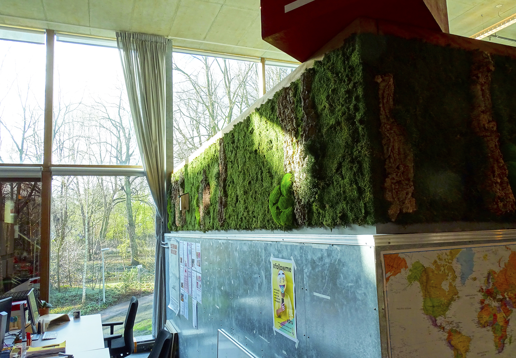 Om de leefbaarheid van de Rode Loper ruimte te verbeteren zijn er wandpanelen van hergebruikte en duurzame materialen geplaatst. We ontwierpen op basis van Biophilic Design een grote greenwall van platmos, bolmos, eikenschors en rendiergras. Daarbij werden ook sanseveria’s geplaatst, die zowel de sfeer als de akoestiek ten goede komen. De originele architectuur van de ruimte is in stand gehouden: alle originele hoeken en bijzondere lichtinvallen geven deze ruimte juist karakter en dat moest behouden blijven.